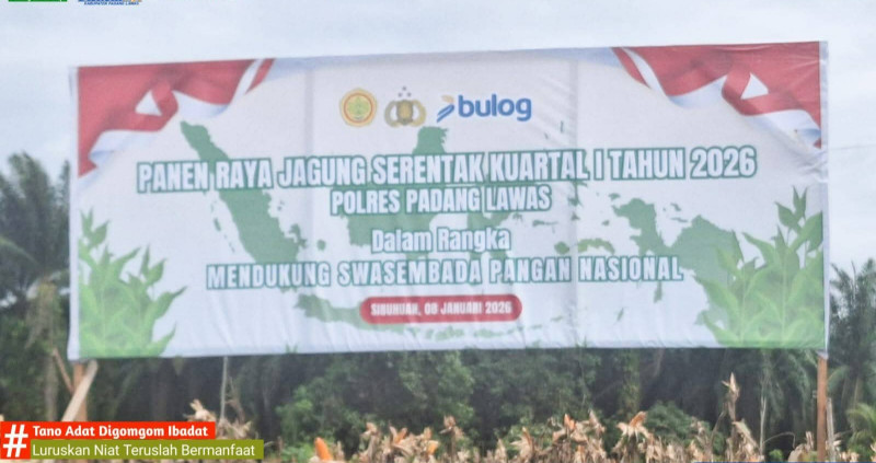 PALAS.WAHANANEWS.CO, Sibuhuan - Panen raya jagung serentak kuartal 1 Tahun 2026 secara simbolis dilaksanakan oleh Kepolisian Resort Padang Lawas (Polres Palas) bersama Pemerintah Kabupaten Padang Lawas (Pemkab Palas) bertempat di Polres Palas, Kamis 08 Januari 2026.
